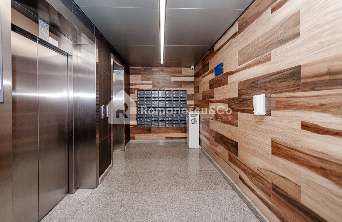 Scările sînt placate cu granit, iar cele 2 ascensoare rapide, silențioase, duc pînă la parcările subterane.