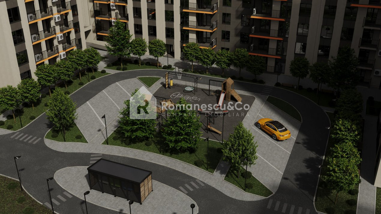 Zona adiacentă blocului va fi complet amenajată cu elemente arhitecturale moderne, bănci, spații verzi, locuri de recreere, copaci, gazon și arbuști — totul pentru confortul rezidenților.