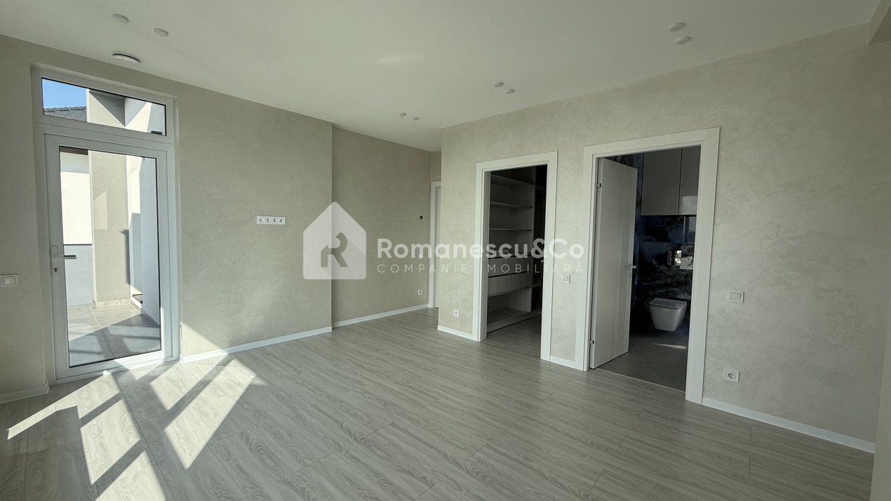 Dormitor matrimonial cu bloc sanitar propriu și garderobă.
