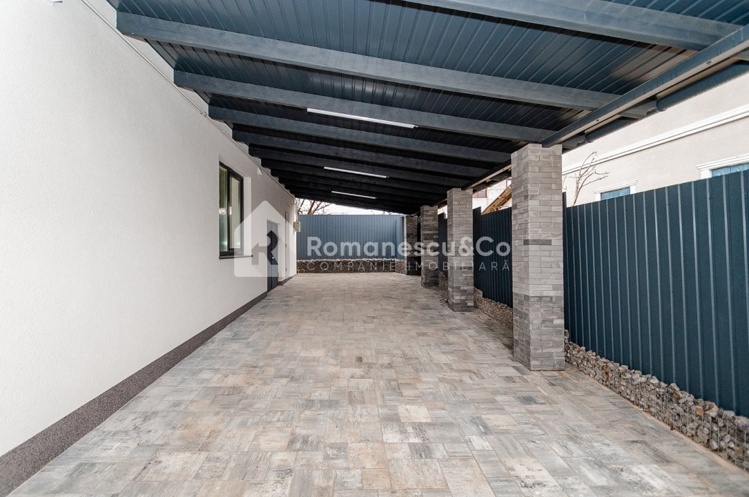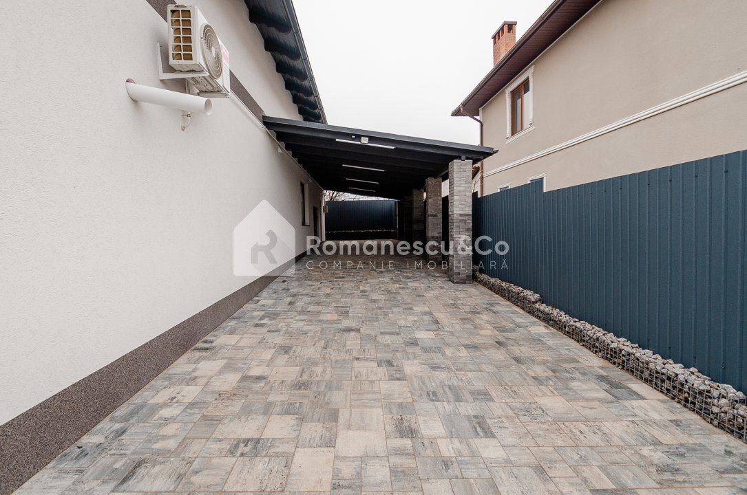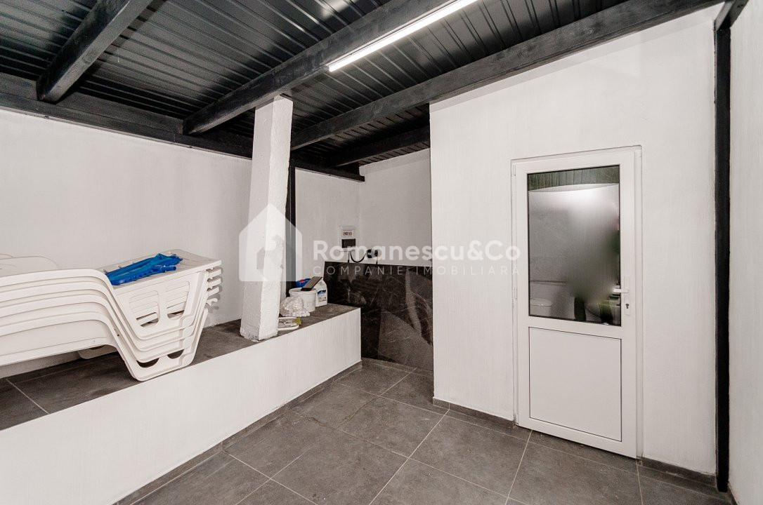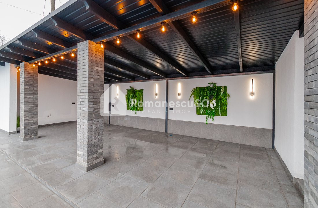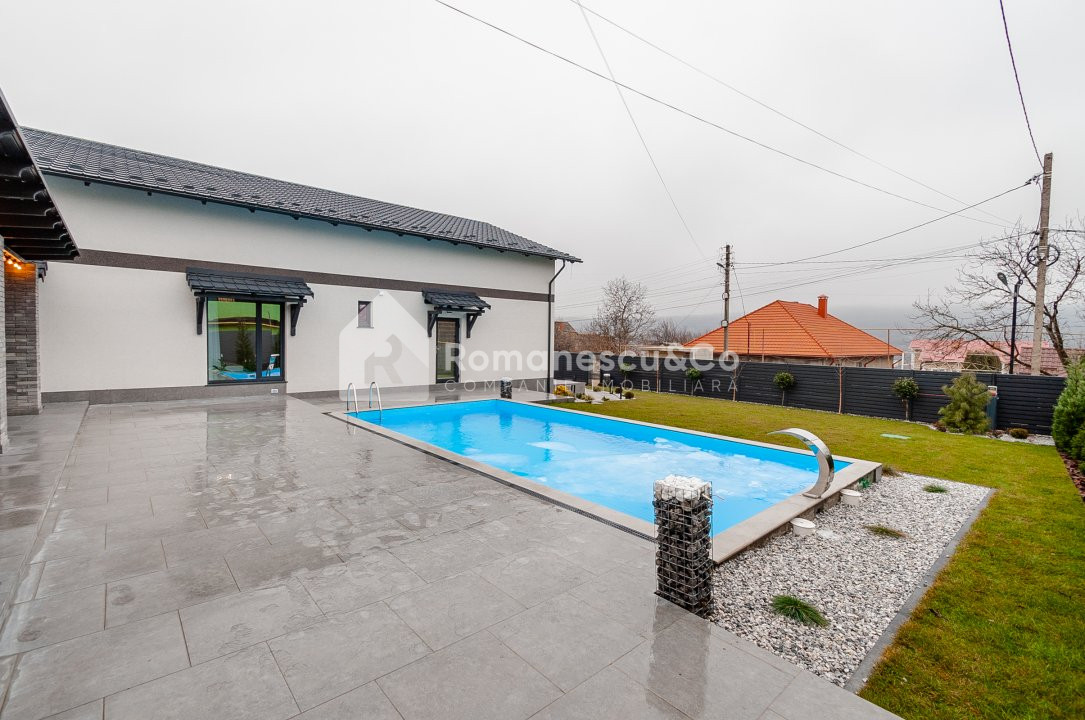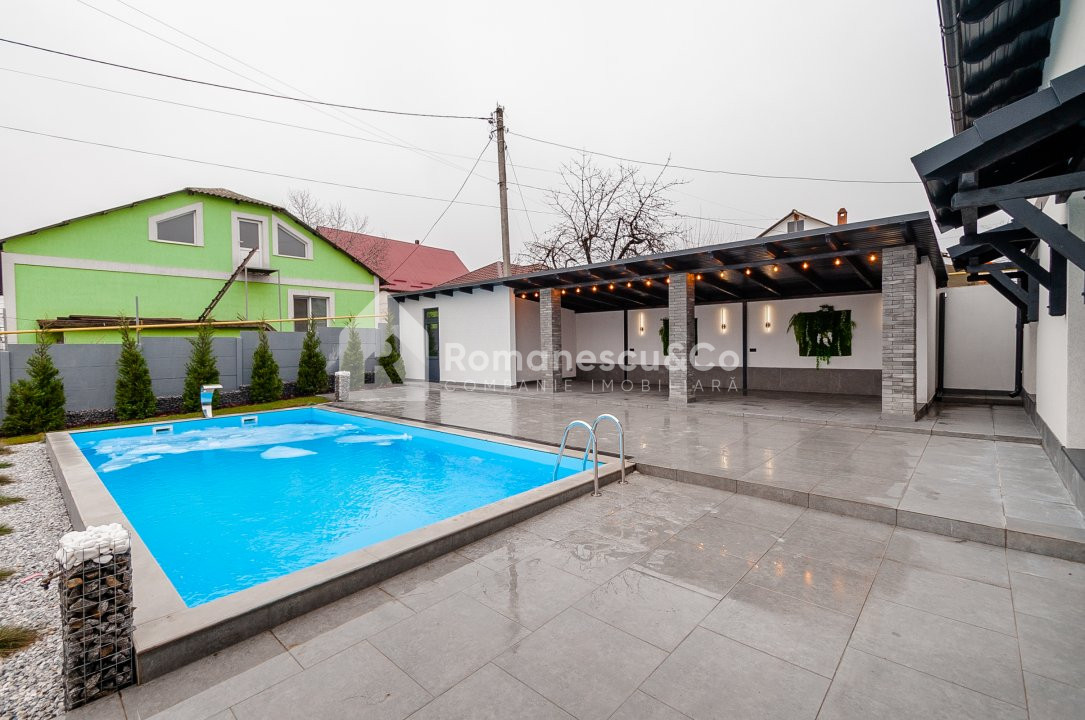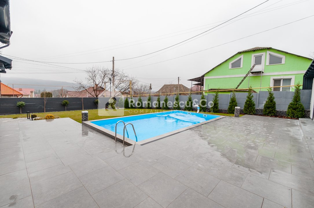 Exterior: curte amenajată cu gazon și pomi decorativi, piscină și 2 locuri de parcare acoperite.