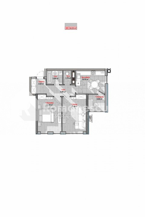 Общая площадь квартиры — 56,25 м². Планировка включает: 2 комнаты, кухню, балкон, 2 санузла и прихожую.