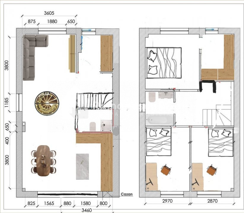 I этаж: кухня с просторной гостиной, санузел;